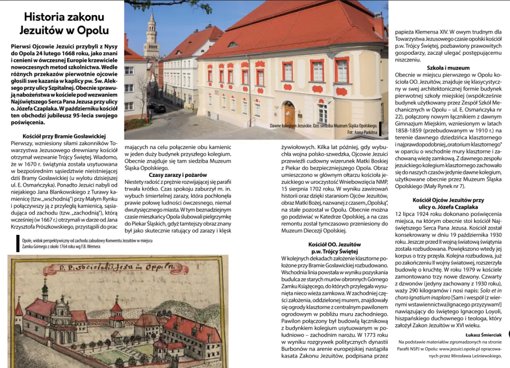 W ramach trwającego jubileuszu 100-lecia powrotu jezuitów do Opola, w magazynie Opole i kropka ukazał się artykół krótko przedstawiający historię począwszy od XVII w.