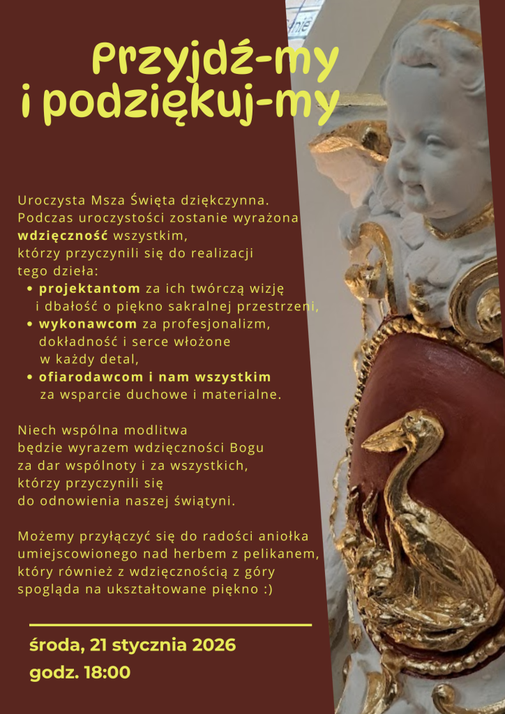 Msza Święta w intencji osób zaangażowanych w odnowę wnętrza naszego kościoła odbędzie się w najbliższą środę o godz. 18.00. Zapraszamy do licznego udziału, by wyrazić naszą wdzięczność Bogu, i tym wszystkim, którzy bezpośrednio pracowali w naszym kościele, by nadać mu ostateczny piękny wystrój. Możemy przyłączyć się do radości aniołka umiejscowionego na herbem z pelikanem, który również z wdzięcznością z góry spogląda na ukształtowane piękno 🙂