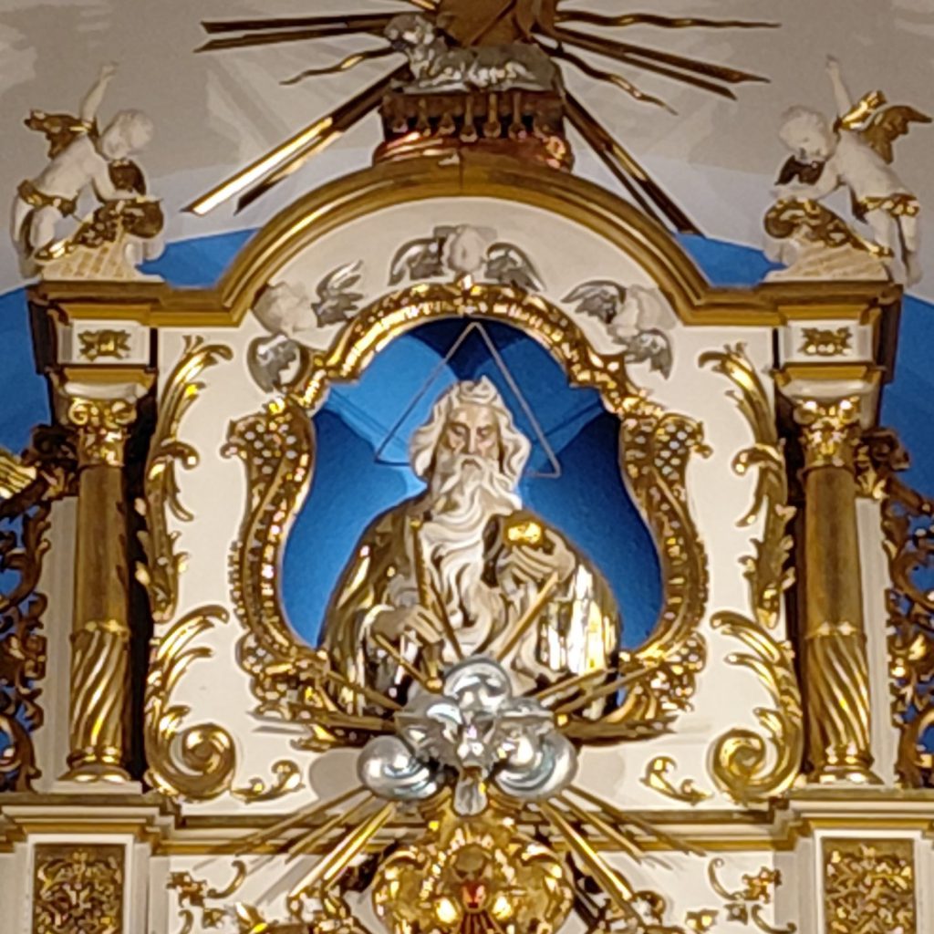 Wizerunek Boga Ojca, znajdujący się w ołtarzu głównym został jeszcze bardzie wyeksponowany przez niebieskie tło. Celem jest, aby ten symboliczny akcent poprowadził nas jeszcze głębiej ku temu, “aby Bóg Ojciec był bardziej znany i kochany“, po prostu byśmy Go odczuwali jako bliskiego ojca, a nie odległego stwórcę. Tak jak w pierwsze poniedziałki m-c kierujemy szczególnie uwagę na Ducha Świętego, tak w ten najbliższy, drugi poniedziałek m-c skierujemy wzrok ku Ojcu Niebieskiemu.