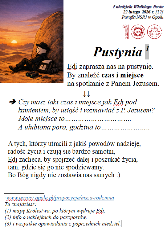 Edi poczuł kolejny raz zaproszenie do tego, aby opowiedzieć nam o kolejnym miejscu, w którym możemy spotkać Boga. Zaprasza nas, abyśmy, szczególnie w okresie Wielkiego Postu, wyszli na pustynie. Ewangelia mówiła, o tym, ze Pan Jezus wyszedł na pustynię aby być kuszonym. To prawda, ale Pan Jezus wyszedł też na pustynię po to, aby Go żadna pokusa nie pokonała. Po 40 dniach i nocach postu, gdy przyszła do niego pokusa, mógł rozpoznać, że pochodzi od złego ducha.