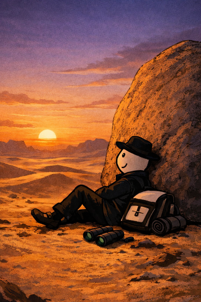 Jeszcze kilka kroków i w końcu mógł odpocząć w cieniu. Zdjął plecak, usiadł, napił się wody i zaczął zastanawiać się, co ma dalej robić. Czuł się zagubiony, nie widział już przed sobą drogi, a pustynia wyglądała bardzo nieprzychylnie. Wiedział też, że nie jest przygotowany na przejście przez pustynię. Miał za mało wody, jedzenia i nie miał schronienia. Słyszał, ze nocą na pustyni jest bardzo zimno. Klęknął i o swoich rozterkach opowiedział Bogu. Po chwili poczuł spokój w sercu. Oparł się wygodnie o kamień i zaczął się rozglądać. Zauważył, że obok kamienia leży jakiś przedmiot. Wstał, podszedł i…. hmmm, to zaskakujące, pomyślał, na ziemi leżała lornetka. Widocznie ktoś ją zgubił. Edi podniósł ją i wtedy pojawiła się myśl w sercu- jedno słowo “OBSERWUJ”. Ach, więc ta lornetka był przeznaczona dla niego!