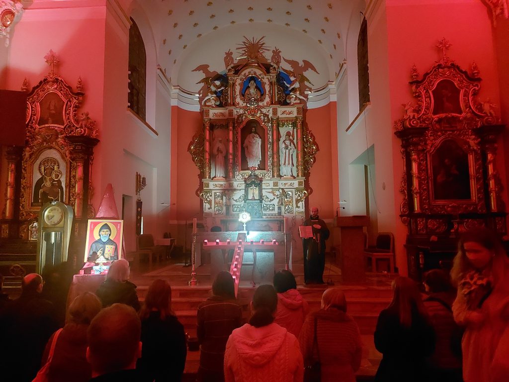 Droga krzyżowa doprowadziła nas do Adoracji Jezusa, który pojawił się pośród nas na ołtarzu, w centrum (naszego wszechświata). Uczył nas miłości płynącej z Krzyża, dotykał wonią świętości, a my, namaszczeni olejem św. Szarbela, mogliśmy pozostać do 24 g z Panem/dla Pana.