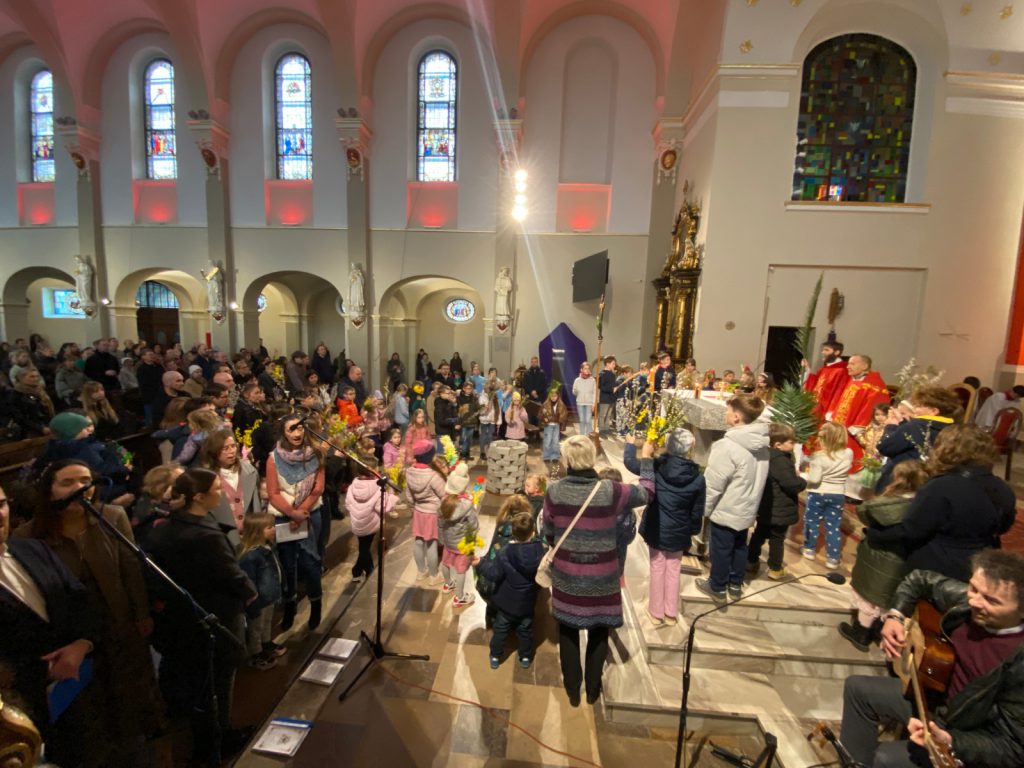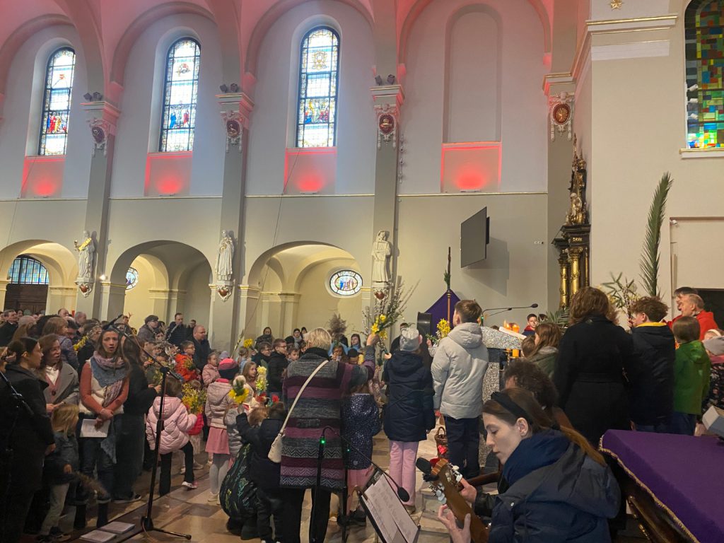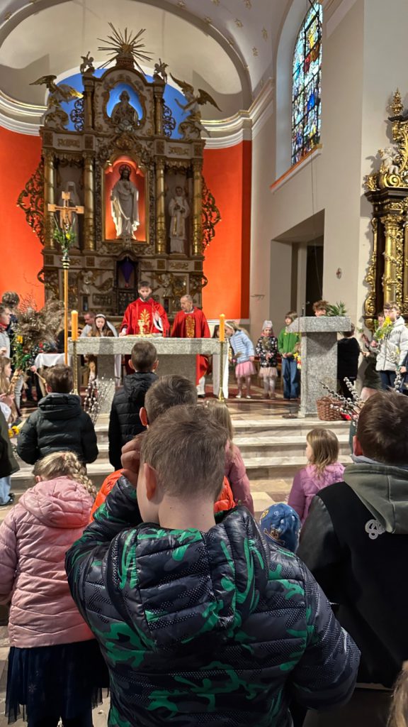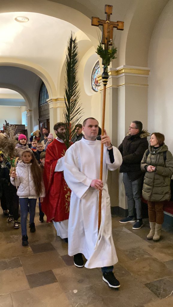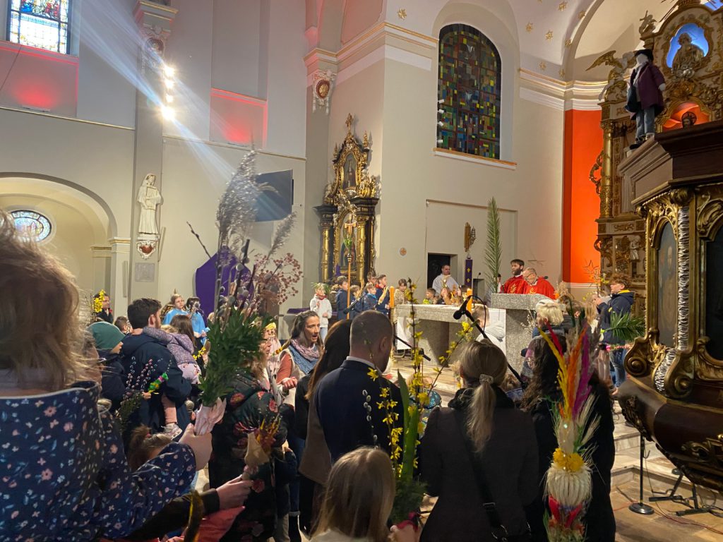 I w naszej parafii tradycji stało się zadość. Na procesji przed kościołem, wierni z palmami w ręku przywitali Jezusa, później palmy zostały poświęcone, a pięknym momentem Mszy, było ustawienie się wiernych wokół ołtarza i odśpiewanie Hosanna z wysoko uniesionymi palmami.