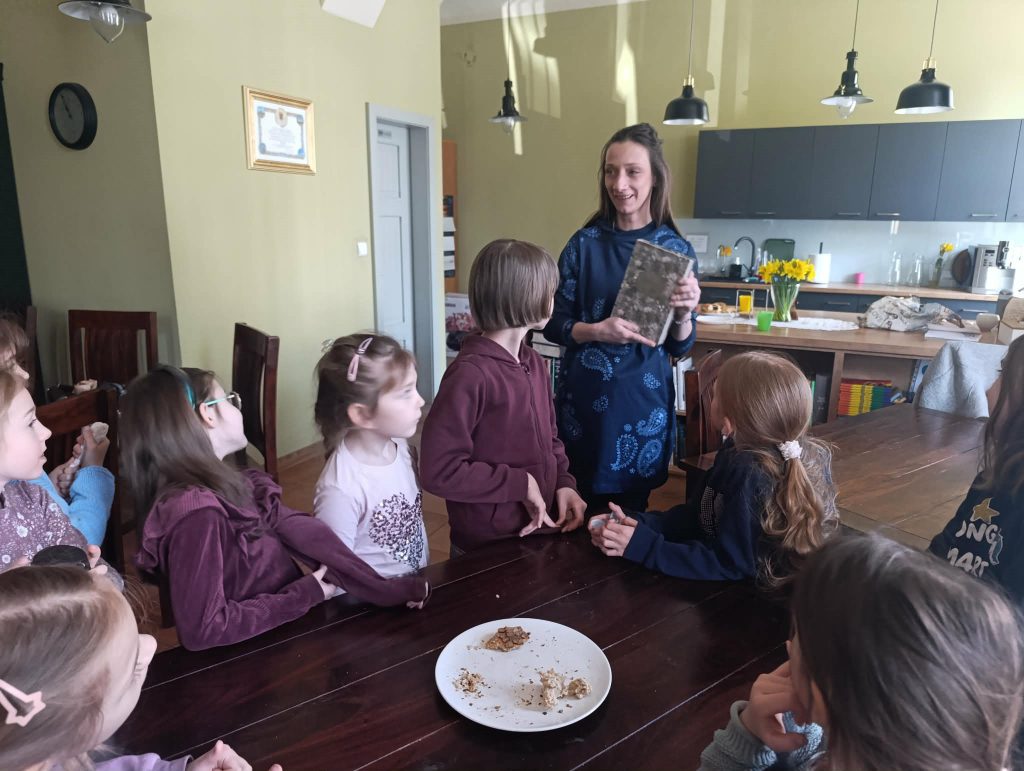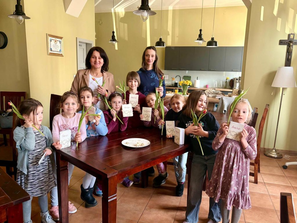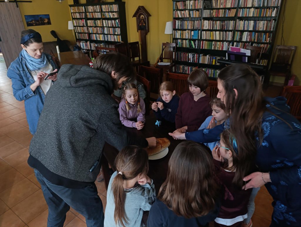 Nasza dziecięca – i na razie dziewczęca – scholka, na próbach nie tylko śpiewa. Jeżeli tylko mamy czas, staramy się pogłębiać duchowość naszych scholistek, rozmawiając na temat służby przy ołtarzu i eucharystii. Na ostatniej próbie postanowiłyśmy dzielić się chlebem, przybliżając w ten sposób słowa piosenki “Chlebie najcichszy, otul mnie swym milczeniem”. Ojciec Andrzej nasz chleb pobłogosławił , każdy z nas zrobił na chlebie znak krzyża i oddaliśmy się radości dzielenia 🙂 Po chlebie zostały tylko ułomki. Na próbie dziewczynki otrzymały od prowadzącej p.Neli -indeks scholistki – aby zbierać w nim “profity” za piękną służbę śpiewem przy ołtarzu. Były też kwiaty z okazji Dnia Kobiet 🙂