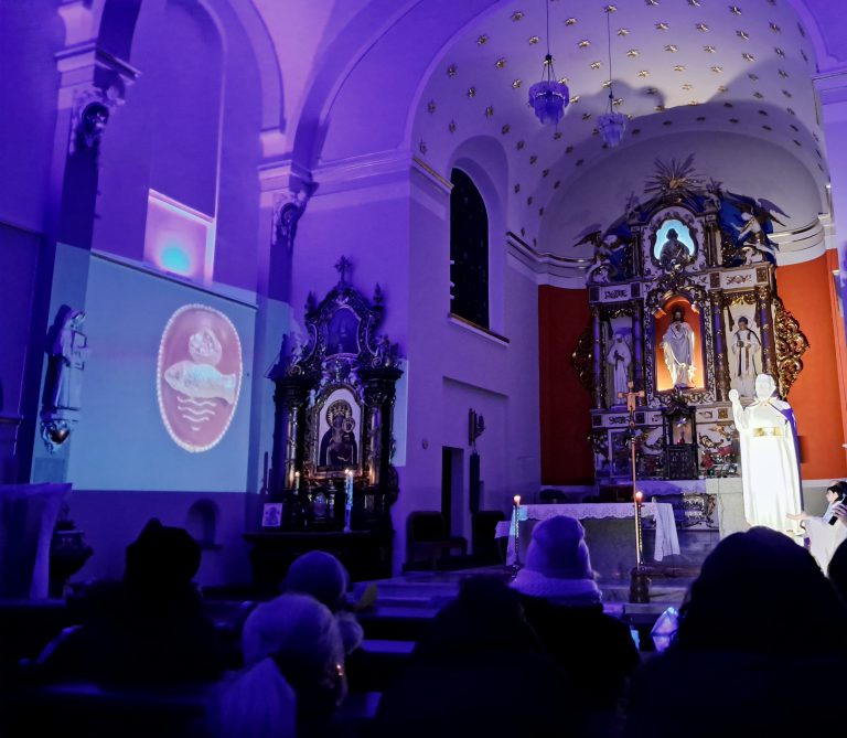 Przez ciemny kościół z zakrystii do ołtarza, z udziałem dzieci